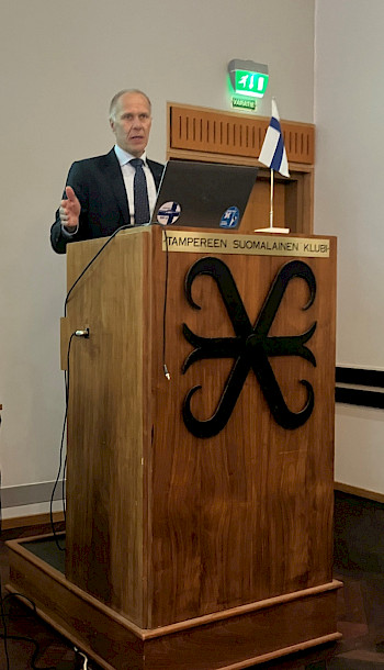 Jouni Koskela nosti puheenvuorossaan voimakkaasti esille sotiemme veteraanit ja kiitollisuutemme heille. - Jouni luovuttaa vuoden vaihteessa puheenjohtajuuden Mikko Hörkölle.
